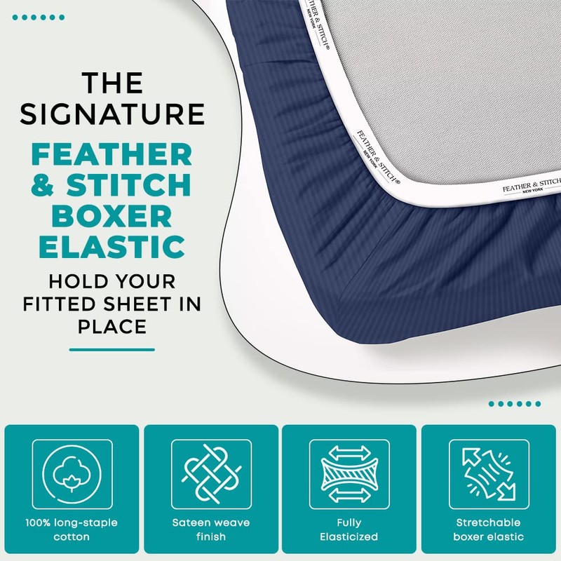 Feather & Stitch 100% Cotton 1 Piece Damask Stripe Full Fitted Sheet 500 Thread Count Dark Blue 18" Extra Deep Pocket Luxury Sateen Weave Stretchable Boxer Elastic Fits Mattress Perfectly