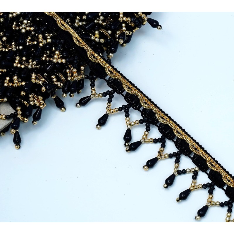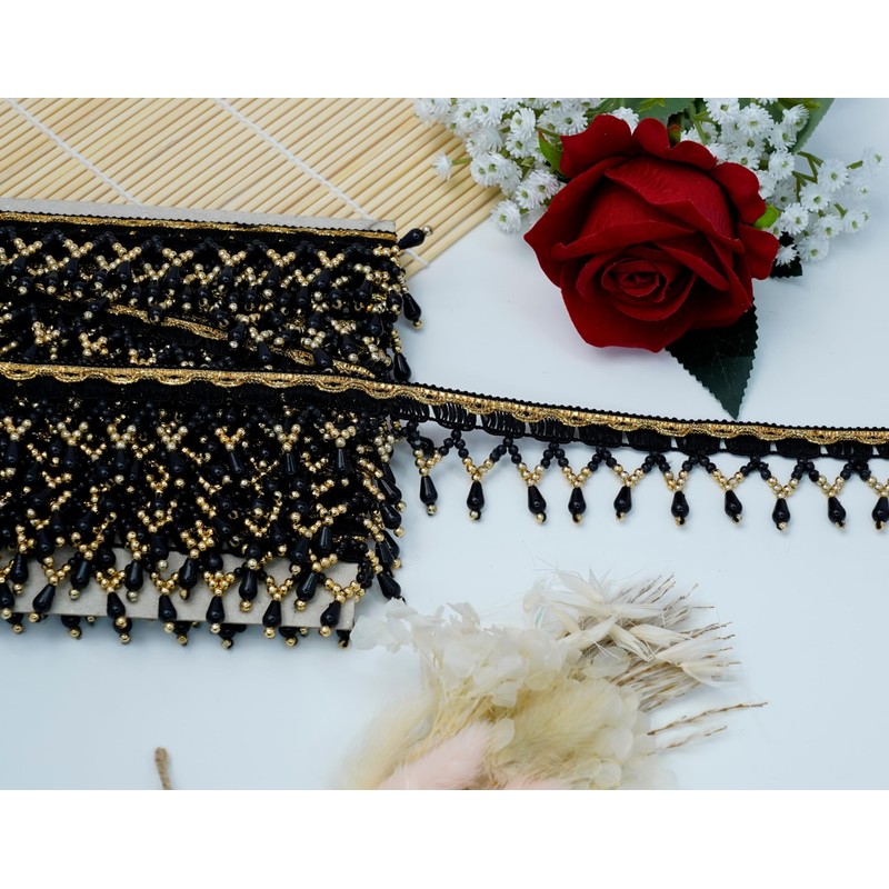 Feathers Creation 2 X Yard Drop Bead Fringe Scallop Bridal Saree Tassel Trim for Lampsade,Table Cloth,Dupatta Edging Curtain Edge Lace Sew on (Black)