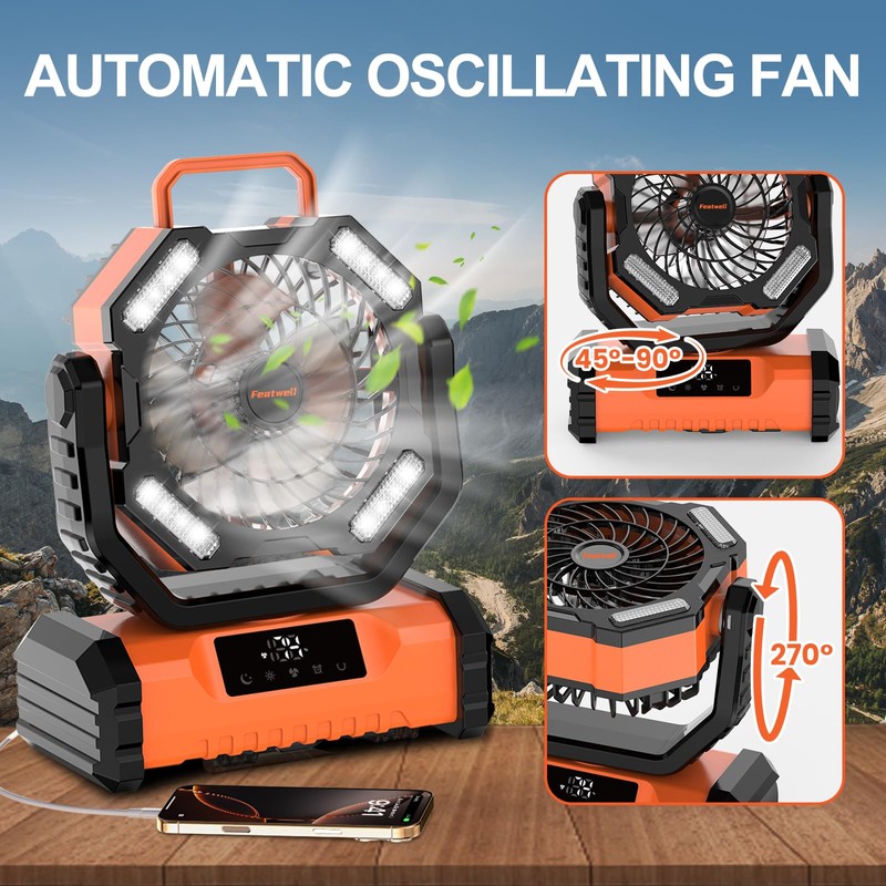 Featwell 20000mAh Portable Fan with Touch Screen, 5-Speed Strong Airflow LED Camping Fan, Ventilador Recargable with Remote for Tent, Camping, Indoor, Travel (Orange)