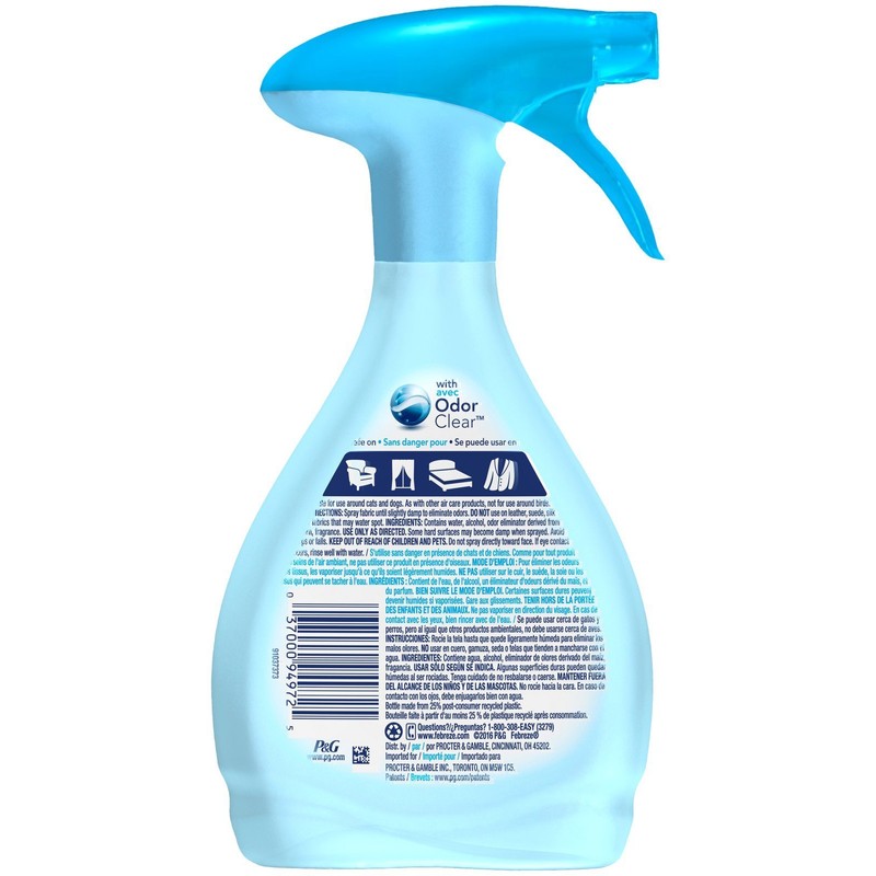 Febreze FABRIC doesn't just mask odors, it cleans away odors from fabrics that you wish you could wash with Odor Clear Technology, leaving your fabrics with a light, fresh scent. The fine mist works deep in fabrics, cleaning them of common odors such as pet smells, smoke, and body odors, helping to freshen the entire room. Perfect to use weekly on soft surfaces including furniture upholstery and rugs/carpets or simply to give your clothing a needed refresh. Add to your regular cleaning routine for whole-home freshness. With Febreze FABRIC, uplifting freshness is simply a spray away.