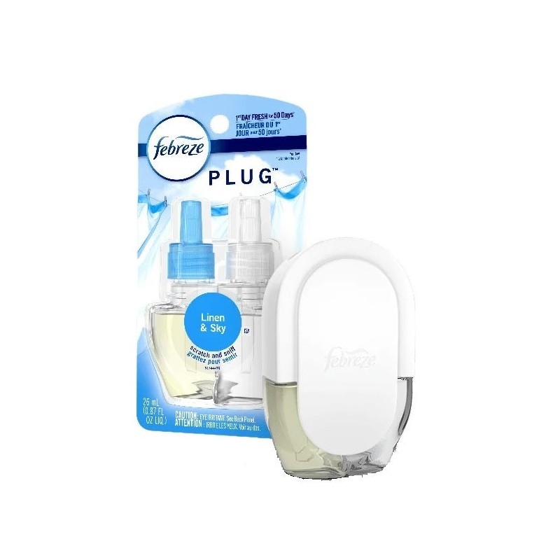 - Start by obtaining a Febreze PLUG with Fade Defy Technology electric oil warmer and a Linen & Sky scent refill. Remove the caps from the refill and insert it into the warmer until they click. Plug the warmer into any outlet, set your desired scent intensity, and relish in the enduring freshness for up to 50 days. * The digitally controlled scent release ensures a consistent fragrance experience from the first to the fifty-first day.
