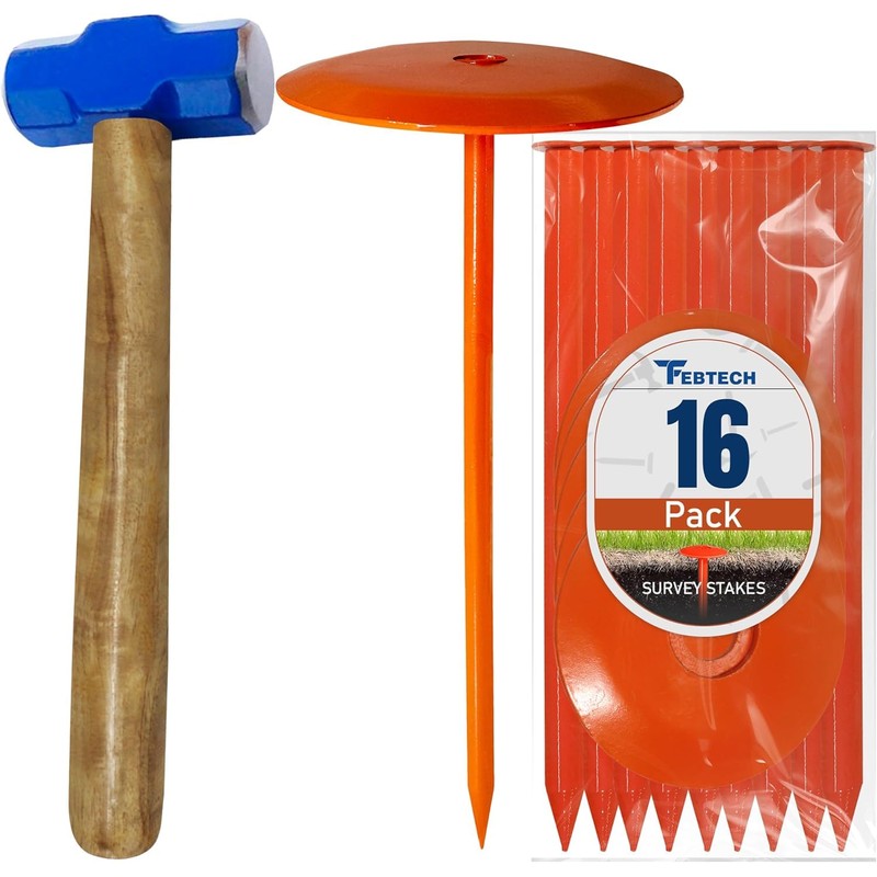 FEBTECH - Septic Tank Marker - 6" x 10" - Suitable Property line Markers for Protecting Your Septic Tank and Property Boundary with Solid and Sturdy Survey Stakes - Pack of 16 Pcs + 1 Hammer