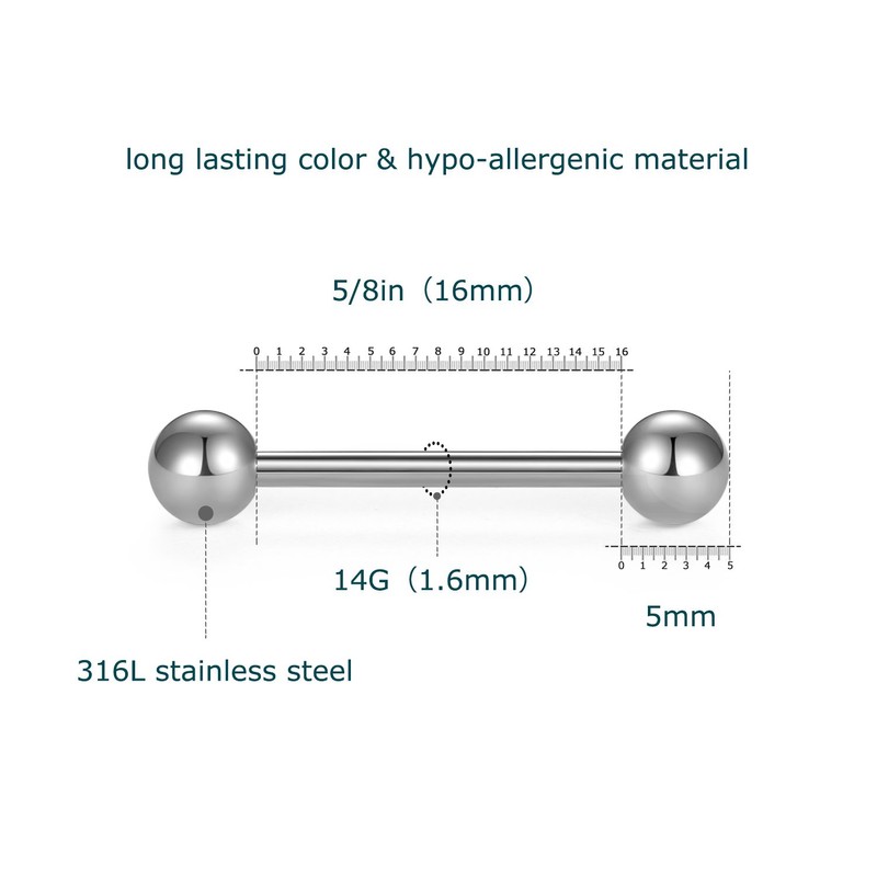 - Bar thickness: 14 gauge (1.6 mm); bar length: 16 mm; ball: 5 mm