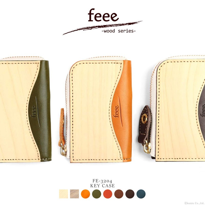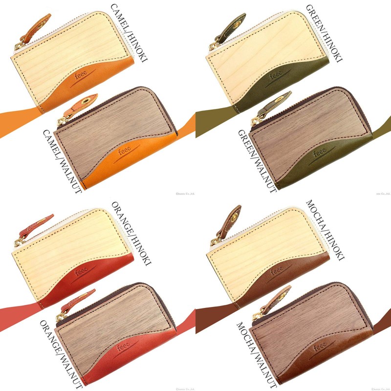 Feee FE-3204 Key Case, Men's, Women's, Genuine Tochigi Leather x Natural Wood, Smart Key Compatible, Card Storage, L-Shaped Zipper, Made in Japan, green (walnut)