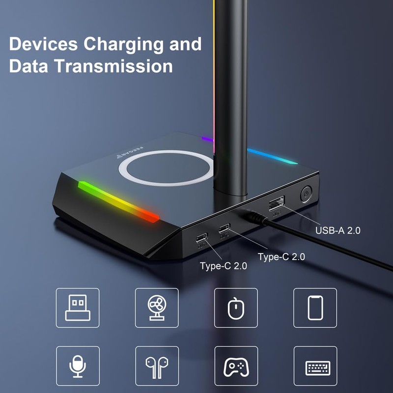 Feegar Hold RGB Headphone Stand with Wireless Charger, Gaming Headset Stand Headset Holder Wireless Charge Headphone Holder with 1 x USB 2 x Type-C 11 Lighting Effects Modes