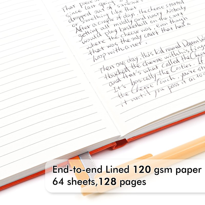 - These classic ruled notebooks are all blank inside with 128 lined pages (64 sheets), which would be convenient for daily usage. The hard cover journal has a water-resistant faux leather cover, round corners and bookmarks, which is designed to lay and open flat. There’s a “date/page” column on the top of every page. You can use it as a reminder to let you remember those important dates and find the page you want in a very short time.