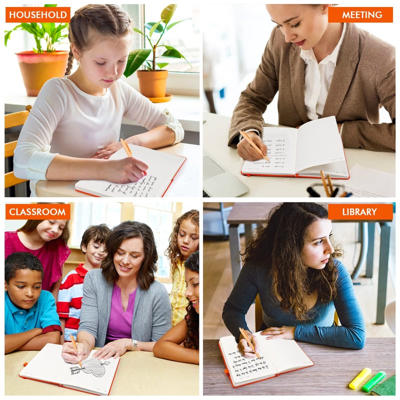 - Feela 24 Pack Classic Ruled Notebooks contains 24 classic orange ruled sturdy cover notebooks and 24 Black Retractable Pens. Each of the notebooks measures 8.3” x 5.1”, which is perfect to carry and easily held by young girls and boys. These black cute pens are customized to be placed in the pen holder, which is pretty convenient.