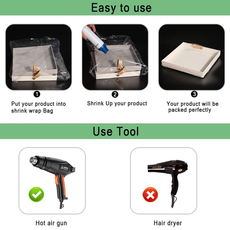 • Easy to Use: Just put the things in the shrink bags and then use a heat gun, heat tunnel to shrink and seal bags evenly until it is surrounded completel. Don't use a hair dryer because it doesn't have enough heat.