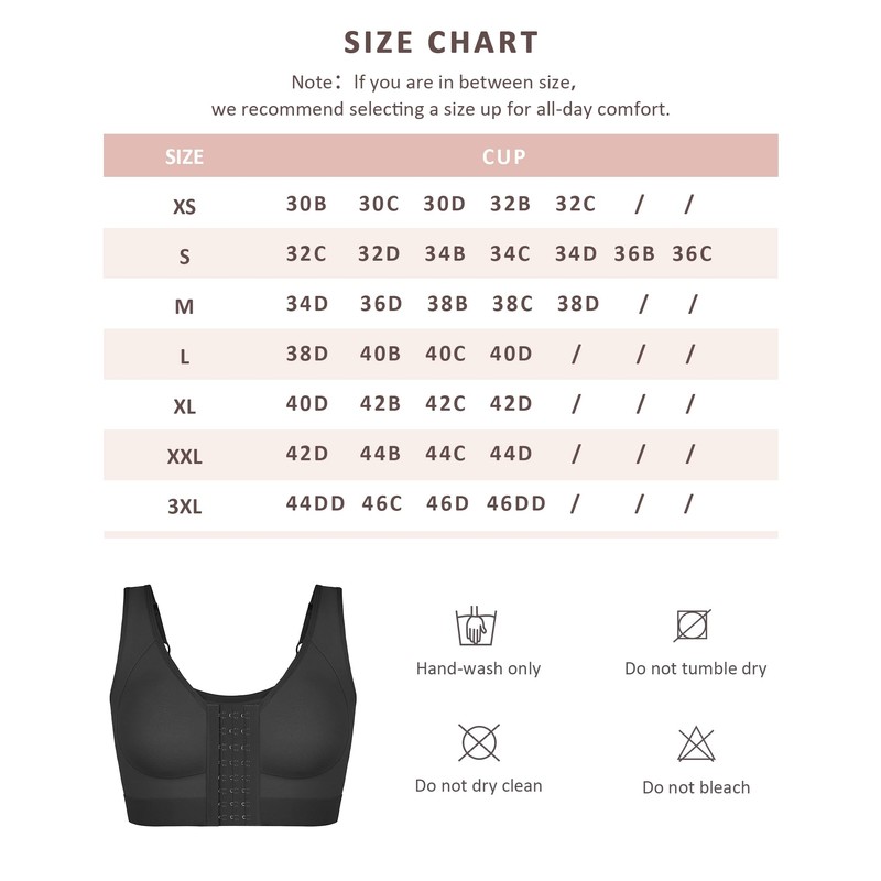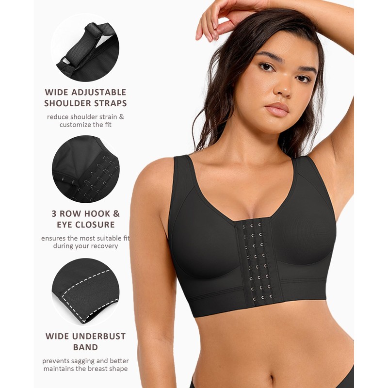 - EASY ADJUSTMENTS: Our shaping compression bra offers versatile adjustments to accommodate various cup sizes effortlessly. The front closure bra features three rows of adjustable hooks, allowing you to find the most suitable fit during your recovery. The wide shoulder straps gently distribute pressure to reduce shoulder strain, and the adjustable straps allow you to customize the fit, ensuring a more personalized and comfortable experience for your bust.