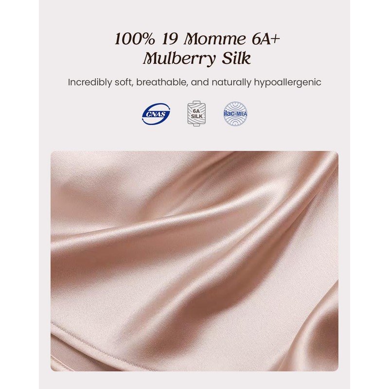 - 19 Momme 100% 6A-Grade Mulberry Silk — Luxuriate in 19 momme silk (22% thicker than standard) with a sleek satin finish. The same high-end silk used in premium designer sleepwear, this ultra-soft, smooth fabric glides over your curves like a second skin.