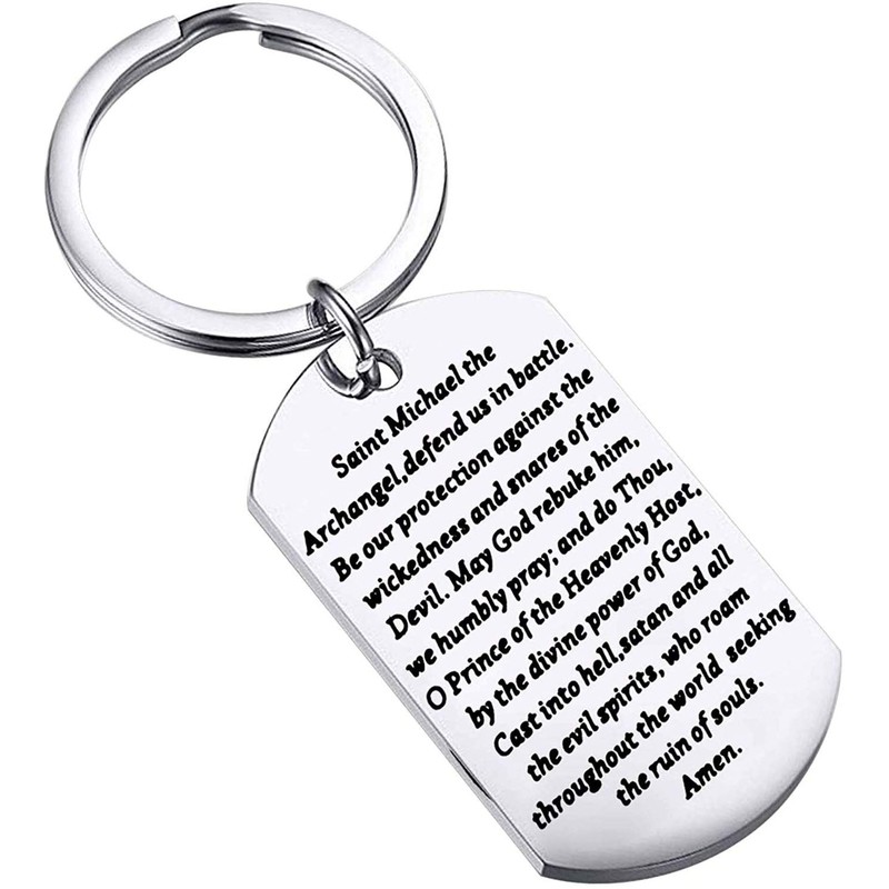 • ❤Christian Faith Jewelry❤This Dog Tag keychain with design hand engraved -Saint Michael the Archangel, defend us in battle. Be our protection against the wickedness and snares of the Devil. May God rebuke him, we humbly pray; and do Thou. O Prince of the Heavenly Host, by the divine power of God. Cast into hell, satan and all the evil spirits,who roam throughout the world seaking the ruin of souls. Amen
