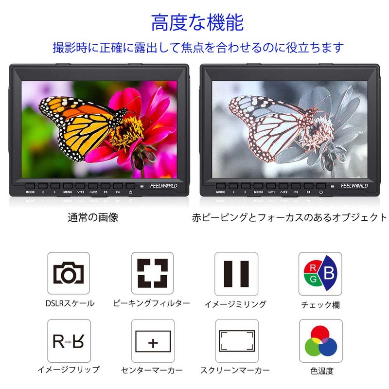 - Advanced Features: * Peek Focus Assist (Red highlights above a part of the black-and-white image that focuses on) * Checkfield (red, green, blue, and mono) * Camera Mode * Pixel * Center Marker * Screen Marker (80%, 85%), 90%, 93%, 96%, 2.35:1) * Image Reverse (H, V, H / V) Image Freeze * Custom Color Temperature