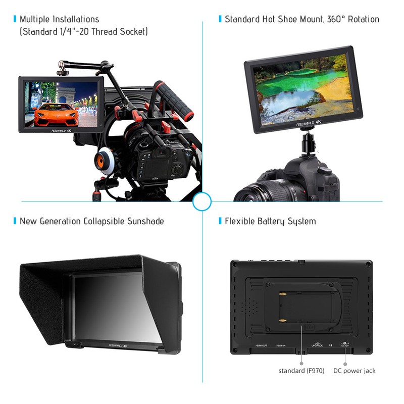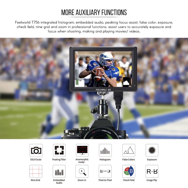 More Auxiliary Functions:Feelworld T756 integrated histogram, embedded audio, peaking focus assist, false color, exposure, check field, nine grid and zoom in professional functions, assist users to accurately exposure and focus when shooting, making and playing movies/ videos.