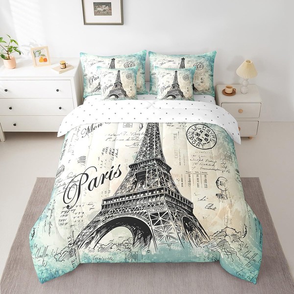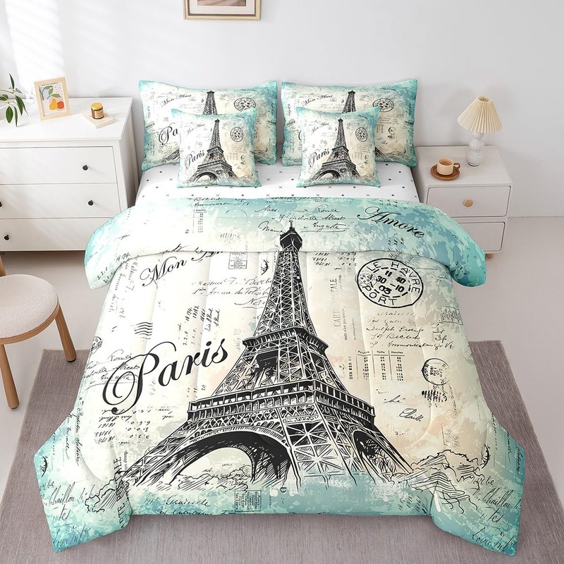 Feelyou Eiffel Tower Comforter Set Full Size 7 Pcs Girls Chic Vinatge French Comforter Bed in a Bag Paris Cityscape Bedding Set Women Eiffel Tower Lover Bed Set with Sheets, Pillowcases, Pillow Covers