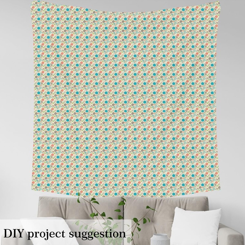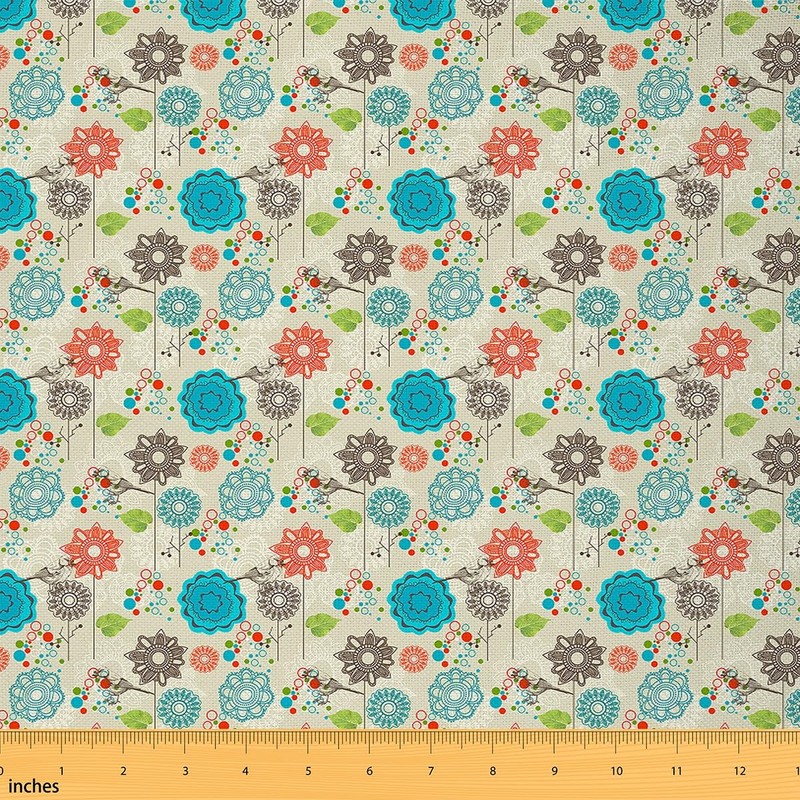 Feelyou Floral Upholstery Fabric by The Yard, Retro Birds Flower Outdoor Fabric by The Yard, Boho Leaf Circles Pattern Decorative Fabric for Upholstery and Home DIY Projects, 3 Yards, Cream Blue