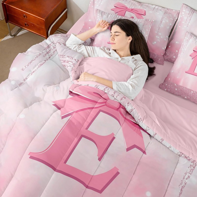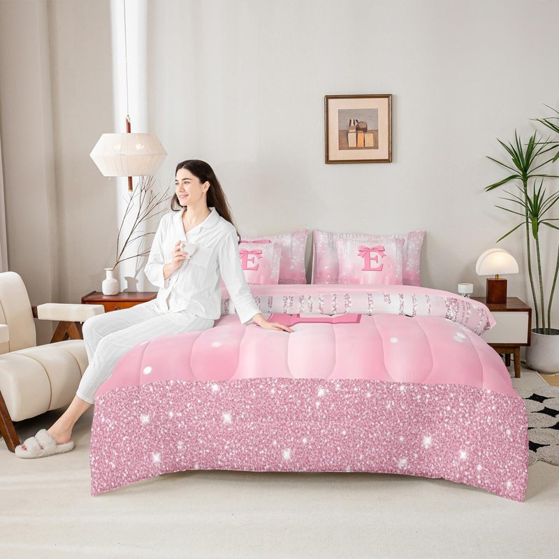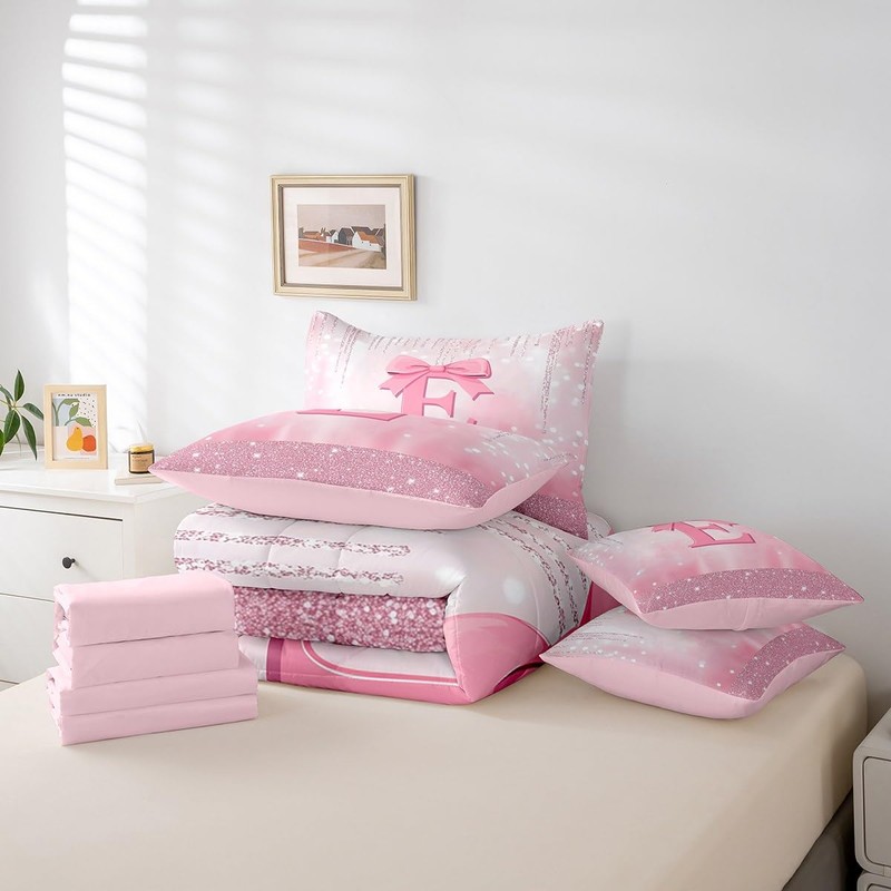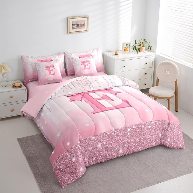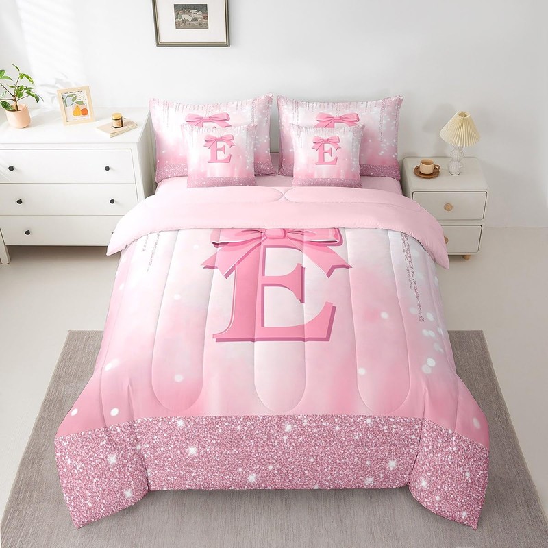 Feelyou Kids Pink Bowknot 7 Pieces Bedding Set Full Size, Personalized Initial E Bed in A Bag Princess Glitter Comforter Set with Sheets Boys Girls Bow Alphabet Teens Bed Set Bedroom Decor 7Pcs