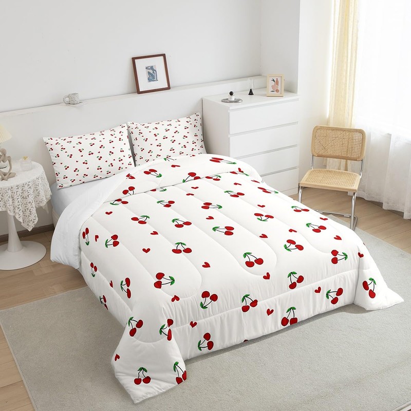 Feelyou Kids Red Cherry Bedding Set Queen Size, Cherry Pattern Comforter Set Boys Girls Cute Fruit Comforter Kawaii Cartoon Fruit Teens Duvet Set Room Decor Bed Set 3Pcs