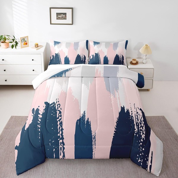 Feelyou Pink Navy Blue Graffiti Comforter Set for Girls Boys Abstract Geometric Comforter Modern Abstract Art Painting Bedding Set Artistic Smear Duvet Set Twin Size Quilt Set 2Pcs