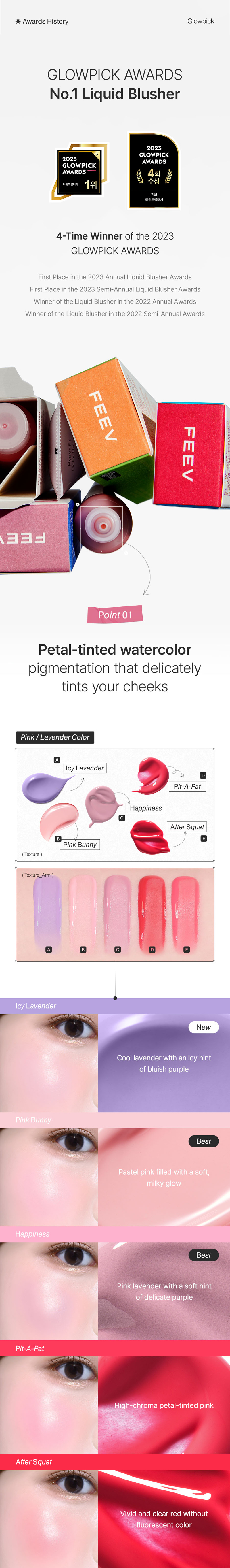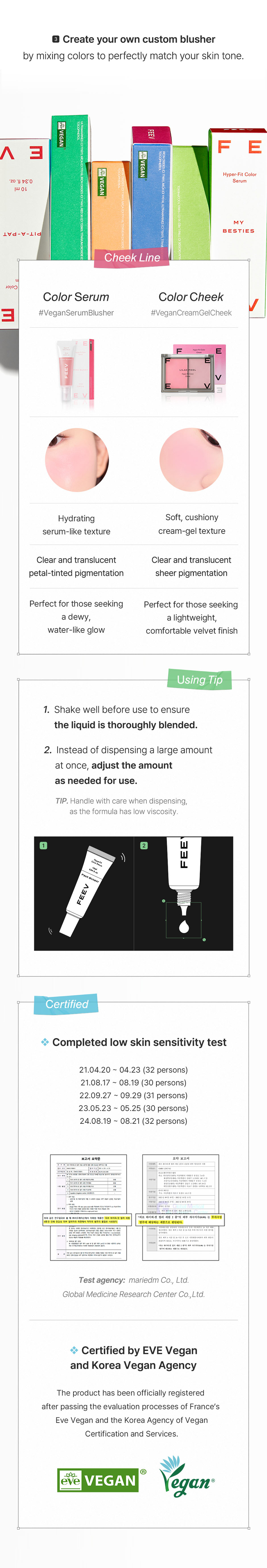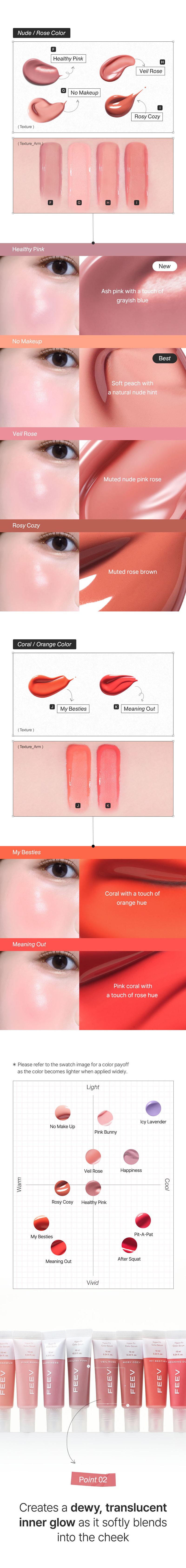 The moment of vitality with FEEV, this is a handy size product. With clear and transparent coloration, it creates a seamless vitality through layering and adjusts the clarity. French Eve Vegan certified, excluding animal ingredients and animal testing products. Shows the flower water coloring that adds freshness and a pure touch beautifully. Its watery serum texture sits on gently to create supercharged dewy color. It sits on with clear colorful radiance leaving no stains. Dermatologically tested for sensitive skin.