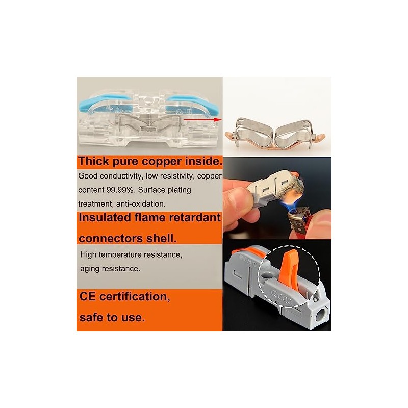 - [Durable and reusable] The lever wire connectors can be reused for multiple times. There are pure copper inside provides great conductivity. Insulated flame retardant connectors shell enable a long service life. High temperature resistance, aging resistance.