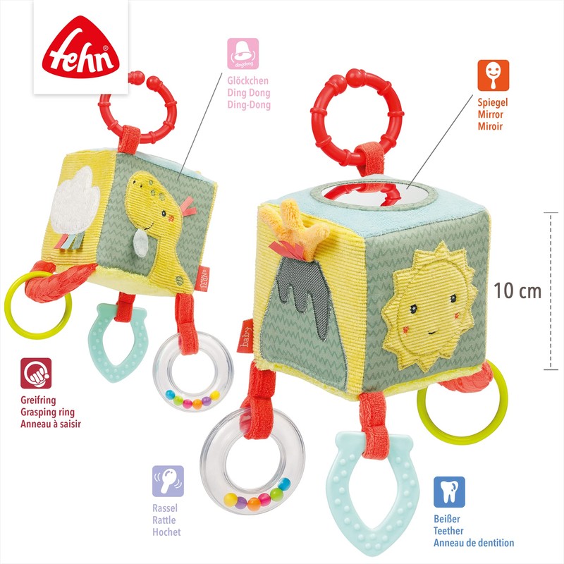 Fehn Happy Dino Motor Skills Cube - Motor Skills Toy Baby Activity Cube for Hanging for Pram, Cot and Baby Seat - Activity Cube Toy for Babies and Children from 0+ Months
