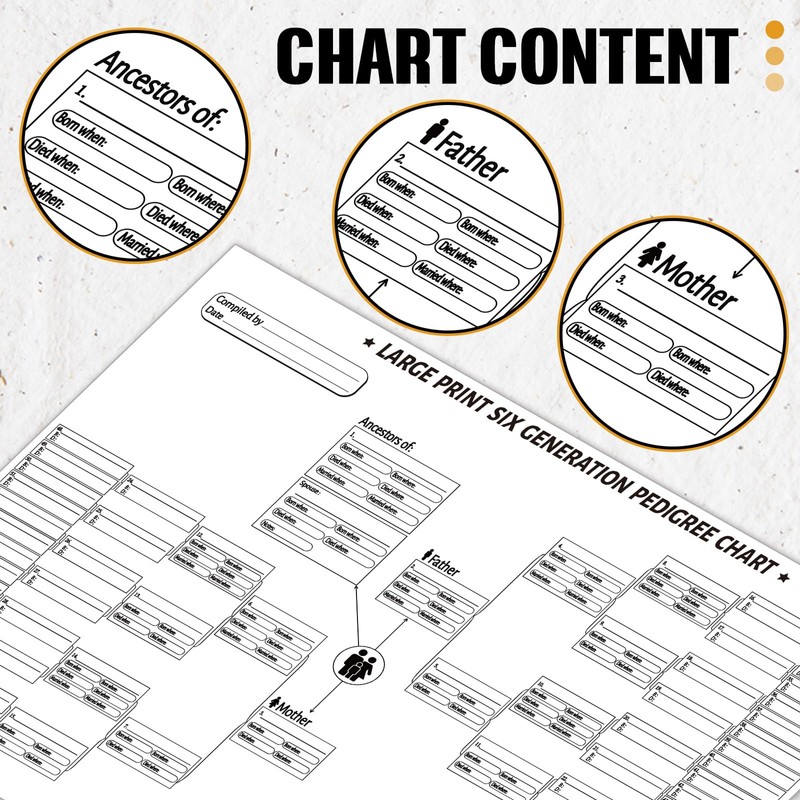 - Capacity for Large Families: each family tree chart has the capacity to accommodate up to 64 individuals; This ensures you can trace back several generations, offering you a comprehensive view of your ancestry and facilitating a study of your family