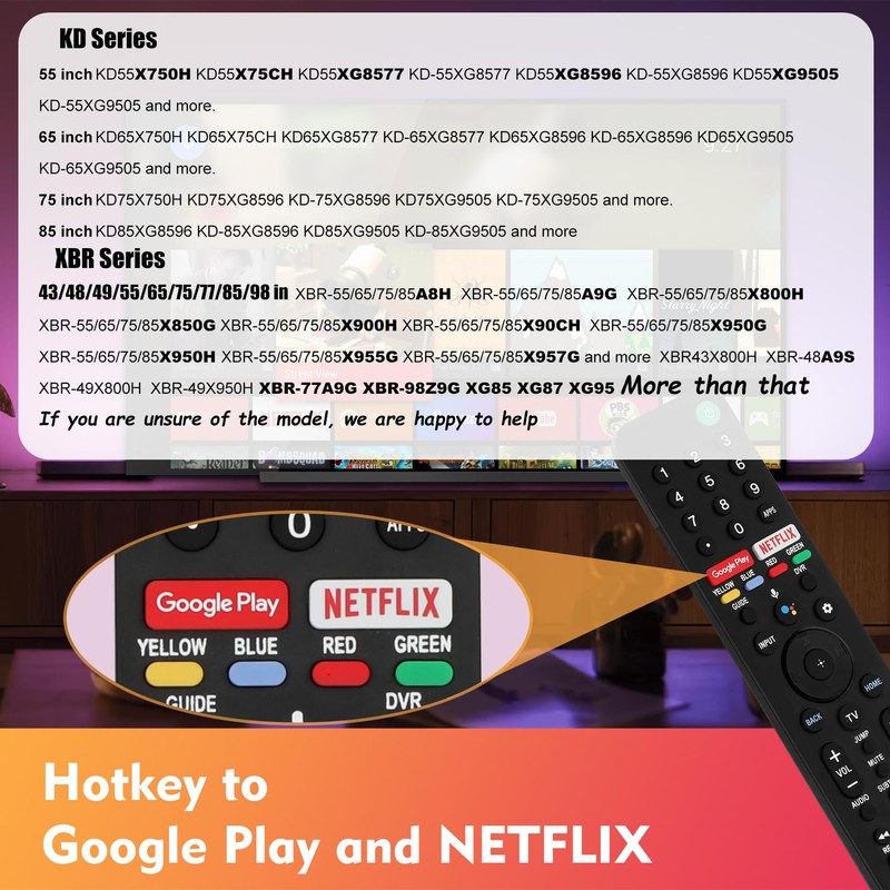 - 【Convenient Function Hotkeys】Our rmf-tx500u remote control for sony smart tv features two big function hotkeys for Google Play and Netflix, making it easier and quicker to find your favorite programs. voice function makes your sony TV smarter, allowing you to find shows, play music, ask about the weather, and more. Our remote control is compatible with most sony smart TVS, making it a great choice for anyone looking for a reliable replacement