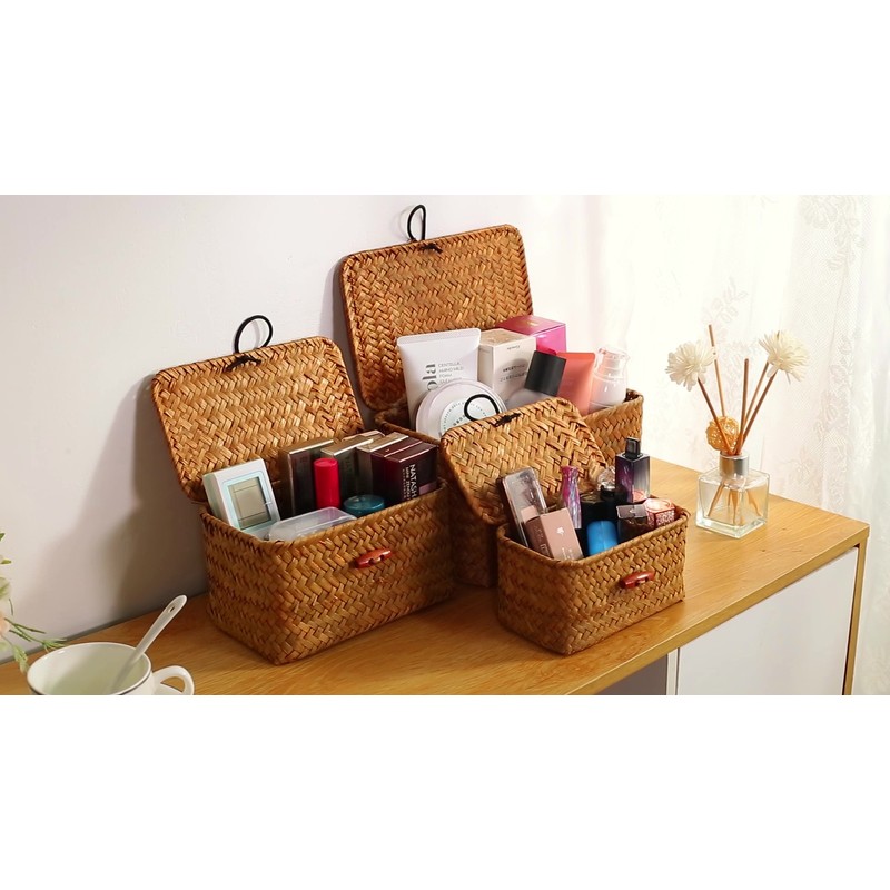 FEILANDUO Shelf Baskets with Lids Set of 3 Handwoven Small Boxes Seagrass Storage Mini Basket Desktop Makeup Organizer Multipurpose Container (Natural, S/M/L)