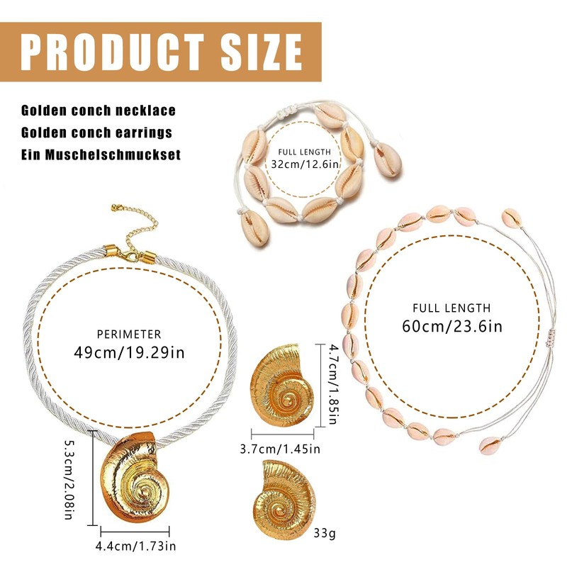 - Product contents: you will receive a 4-piece set consisting of 1 pair of shell earrings and 1 shell necklace, 1 shell choker necklace and 1 shell anklet. The size of the earrings is 3.7 x 4.7 cm and the colour is gold. The length of the necklace is 49 cm and the colour is gold. and it enchants with its elegant gold finish.