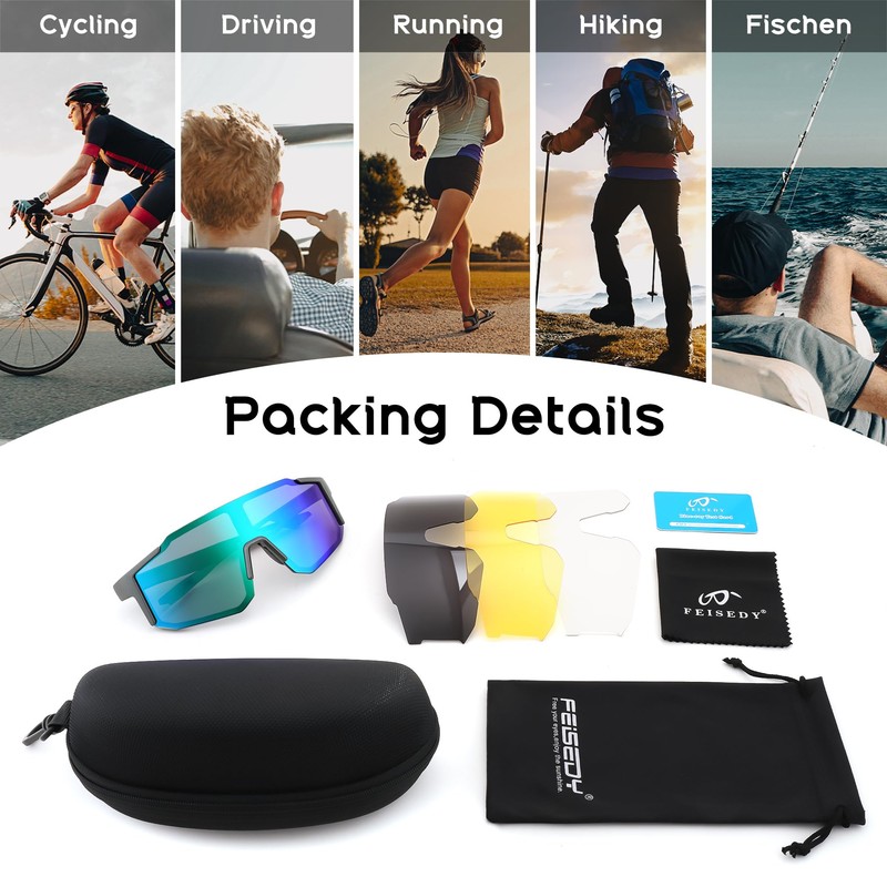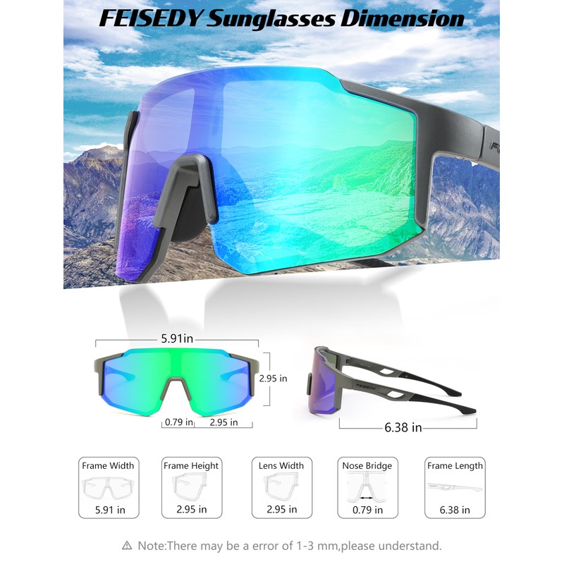 - [Perfect Fit] The silicone nose pads ensure a comfortable, pressure-free fit. Flexible and stable temples ensure the sunglasses adapt well to both wide and narrow head shapes. Made with shatterproof PC lenses for durability. FEISEDY sports sunglasses provide an excellent experience for cycling and other outdoor activities.