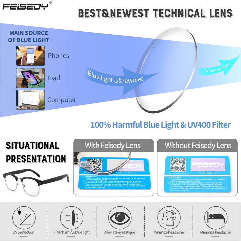 - FEISEDY BLUE LIGHT BLOCKING LENS - Semi-rimless glasses frame comes with blue light blocking lenses are very suitable for people who are facing mobile phones and computers for a long time.