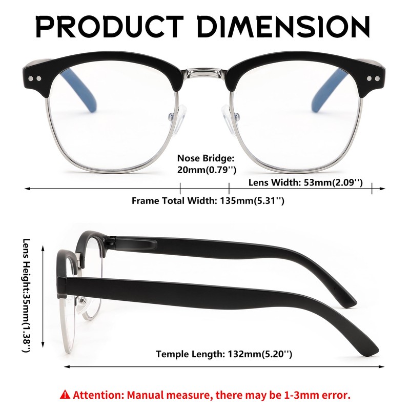 - PREMIUM MATERIAL – High quality plastic half frame with metal nose bridge, scratch-resistant clear lenses, solid smooth metal hinges, soft silicone nose pads, this is a pair of very durable and comfortable glasses.