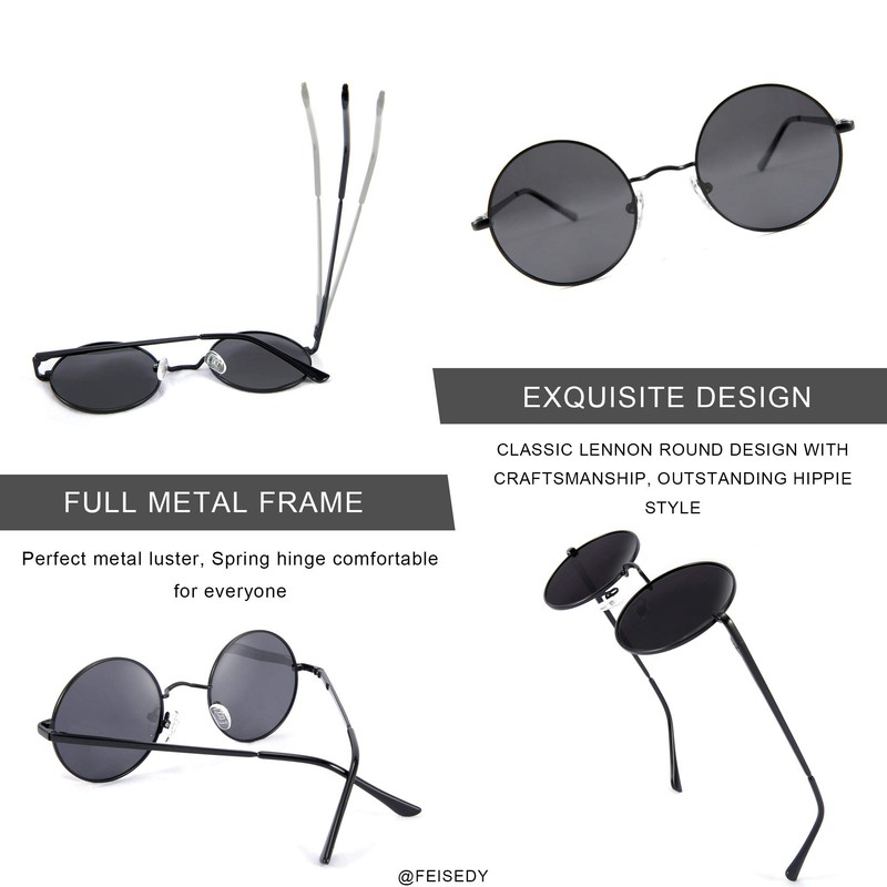 - FEISEDY Design: Hipp chic lightweight round style (only 20 g), high-quality military elastic spring hinge, comfortable straps, perfect fit for head and face. FEISEDY classic round sunglasses lead your fashion trend style.