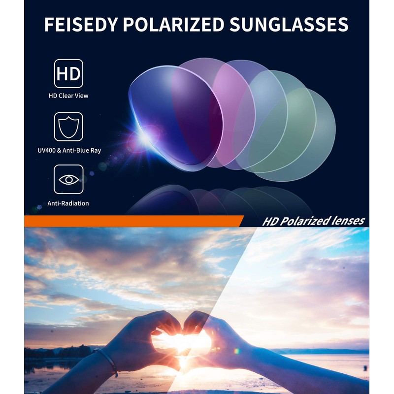 - HIGH-DEFINITION UV400 TAC POLARIZED LENSES -- FEISEDY TAC polarized lenses filter out sunlight reflected glare, protect your eyes from long-term damage by blocking 100% of harmful UVA and UVB rays.