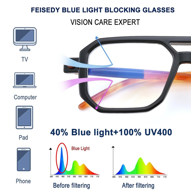 - Blue Light Blocking Glasses - FEISEDY anti-blue light lenses help you block almost 100% harmful blue light in mobile phones, computers, TVs, LED lights and other electronic products to prevent glare, reduce eyestrain and headache. Bring you better sleep and better spirits. Enjoy your digital time with FEISEDY anti-blue light lenses!