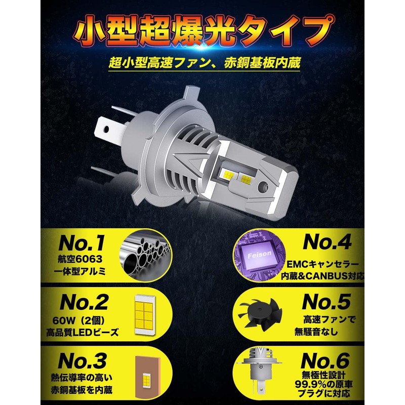 Product Specifications: Car / Motorcycle LED Headlight, Built-in Noise Cancellation, Non-polarity design, Constant Current Protection Circuit / Model Number: H4/H19 / Color: White (6500K) / Wattage: 60W (total of 2 bulbs) / Brightness: 16,000LM / Set Quantity: 2 pieces/Voltage: DC 12-30V / Operating Environment: -40°C to +80°C Lifespan: 50 00+ hours Warranty: ※If there are any problems or defects occurring within one year of the date of your order, please contact us and we will responsibly responsibly responsibly. [Note]: Some products are very similar to the product image and other products are different from the ones we use. Please check the "Feison" brand shop before purchasing.