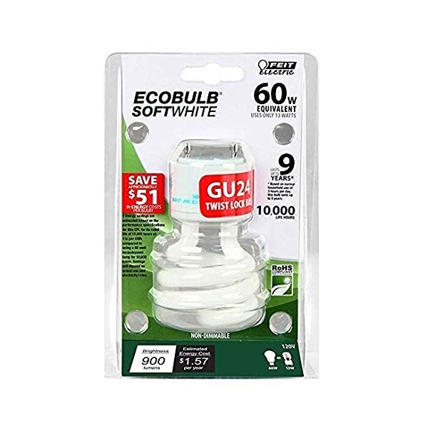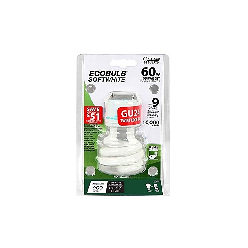 The Feit Electric BPESL13T/GU24 60W Mini Twist GU24 Base CFL 2700K soft white light is non-dimmable and will replace a 60-watt equivalent incandescent bulb. It produces a similar light output of 900 lumens, uses 13 watts of electricity and up to 78% less energy than a standard incandescent light bulb. This compact fluorescent light is ideal for ceiling fans, chandeliers, table lamps, or wall sconces. Feit Electric CFL bulbs have a relatively cool running performance, an average life of 10000 hours / 9.1 years and are RoHS / FCC compliant. Choose a dependable, general purpose lighting bulb for residential or commercial applications
