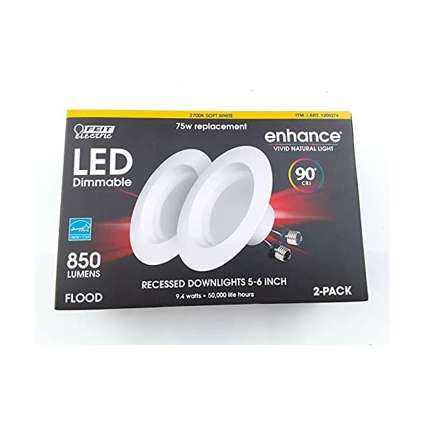 Enjoy all the benefits of advanced LED energy-saving technology with the 2-Pack 75W Feit Electric 5 & 6 Inch Retrofit Kit with adjustable neck design. This kit will fit most 5 & 6 inch recessed cans, includes a 2700K soft white light that is dimmable and will replace a 75-watt incandescent bulb. It produces a similar light output (850 lumens), uses 9. 4 watts of electricity and up to 83% less energy than a standard incandescent light bulb. Get instant on to full brightness with relatively cool running performance. Feit Electric Retrofit Kits last up to 50, 000 hours / 45 years and are RoHS Compliant. This kit is easy to install, comes with a standard base adapter and a pre-mounted trim. Choose a dependable indoor/outdoor Energy Star Approved retrofit kit for residential or commercial high ceiling applications.