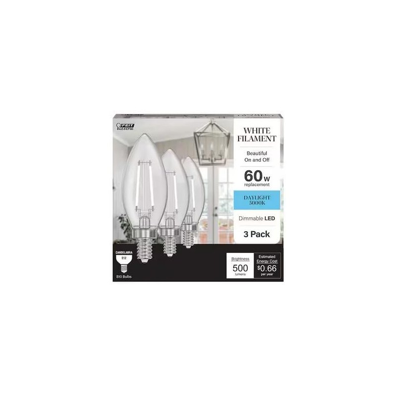 Feit Electric B10 E12 Candelabra LED Light Bulb, Clear Glass, Daylight 5000K, Dimmable, 60-Watt Equivalent, 3-Pack