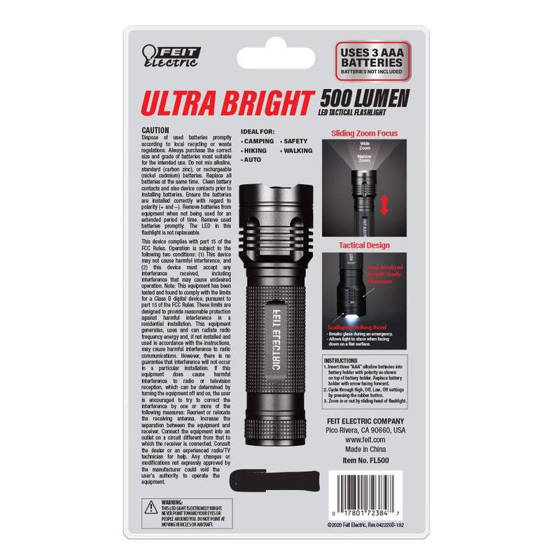 When the need for a flashlight occurs, reach for an ultra-bright, high performance Feit Electric 500 Lumen LED tactical flashlight. This compact and lightweight flashlight produces up to 500 lumens of light. Operating on 3 AAA batteries (NOT INCLUDED), it can last up to 9 hours on low lumens settting and 2 hours 45 minutes on high lumens setting. It has a non-slip cross grooved grip, a durable wrist strap and is impact resistant up to 1 meter. Choose from 2 different lumen settings, 500 (high beam) or 170 (low beam). Pull the flashlight head out to illuminate objects as far as 558 feet away, or push it in to widen the beam. Design with tactical strike bezel and can break glass during an emergency. The mighty compact flashlight is constructed from durable hard anodized aircraft grade aluminum alloy and treated with a special coating to resist rust and corrosion, this is a perfect accessory for camping, hiking trips, auto, safety, walking, emergency and more. Choose a dependable weather resistant flashlight for any emergency or non-emergency applications.