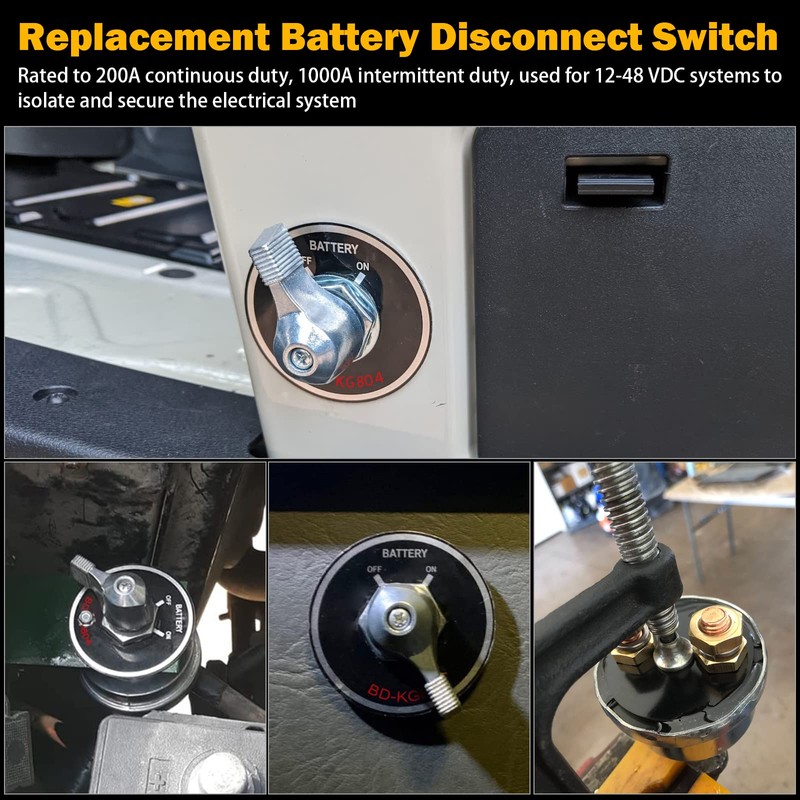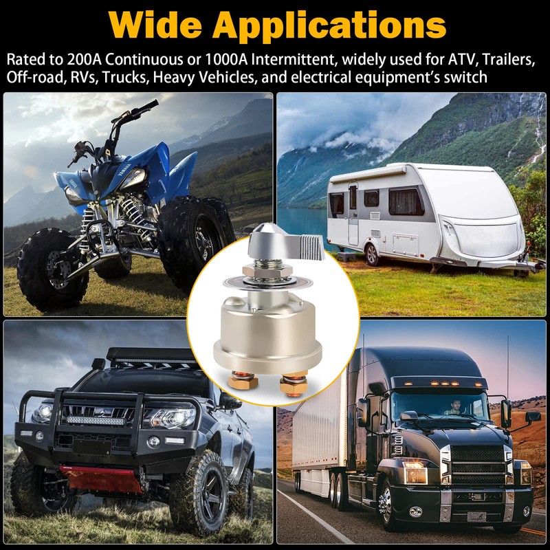 - Master battery disconnect switch rated to 200 Amps continuous duty, 1000 Amps intermittent duty, made of robust aluminum alloy heavy duty housing, strong weather resistance and long service lifespan, used for 12-48V DC systems to isolate and secure the electrical system. The cable fit for 3/8" stud. Widely used for ATVs, Trailers, UTVs, Cars, Marine Outboard, Off-road, RVs, Trucks, Heavy Vehicles, and electrical equipment's switch.