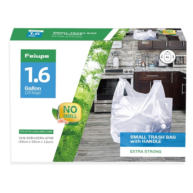 - 【No smell & Eco-friendly】Feiupe 1.6 gallon trash bags are made of pure PE material,no smell,no breakable,more environmentally friendly,more durable.