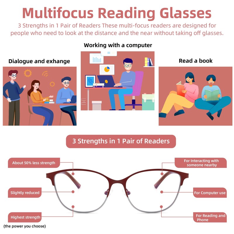 - ✓ Workspace multifocal glasses: Designed for those who spend long period at desk or other workspace, provides greater comfort and visual clarity; The bottom part of the lens is full-power magnification, then used for close up activities; The middle part is slightly reduced power magnification for working on computer, watching TV, etc; Top part is half-power magnification for desk-range daily communication
