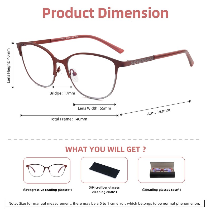 - ✓ Product Dimension - Lens Width: 55mm (2.17inches); Lens Height: 40mm (1.57inches); Temple Length: 143mm (5.63inches); Nose Bridge: 17mm(0.67inches). Value Package- 1 Pack multifocus progressive reading glasses with blue light protection + 1 hard protective case + 1 microfiber glasses cleaning cloth.