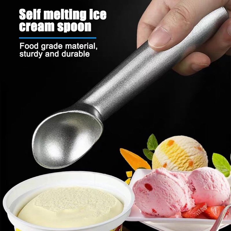 - 【Wearable & Sturdy Material】: Our product is made of aluminum alloy. Aluminum alloy has good thermal conductivity, which allows our products to quickly transfer the temperature of the hand to the spoon and in turn helps to melt the frozen surface of the ice cream or sorbet. The lower density of aluminum alloy makes the spoon lighter and easier to hold for longer periods of time without fatigue.