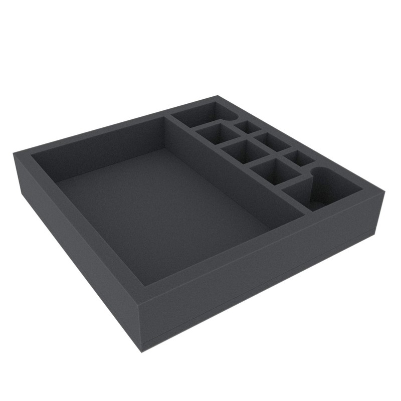 • The set consists of two foam inserts to safely and neatly store all 30 miniatures and all the play material of the expansion. Plus matching foam lid. The lid of the board game box stands approx. 5-6 cm across. Includes Flex Cross Band green (size L) for a stable fit of lid and box.