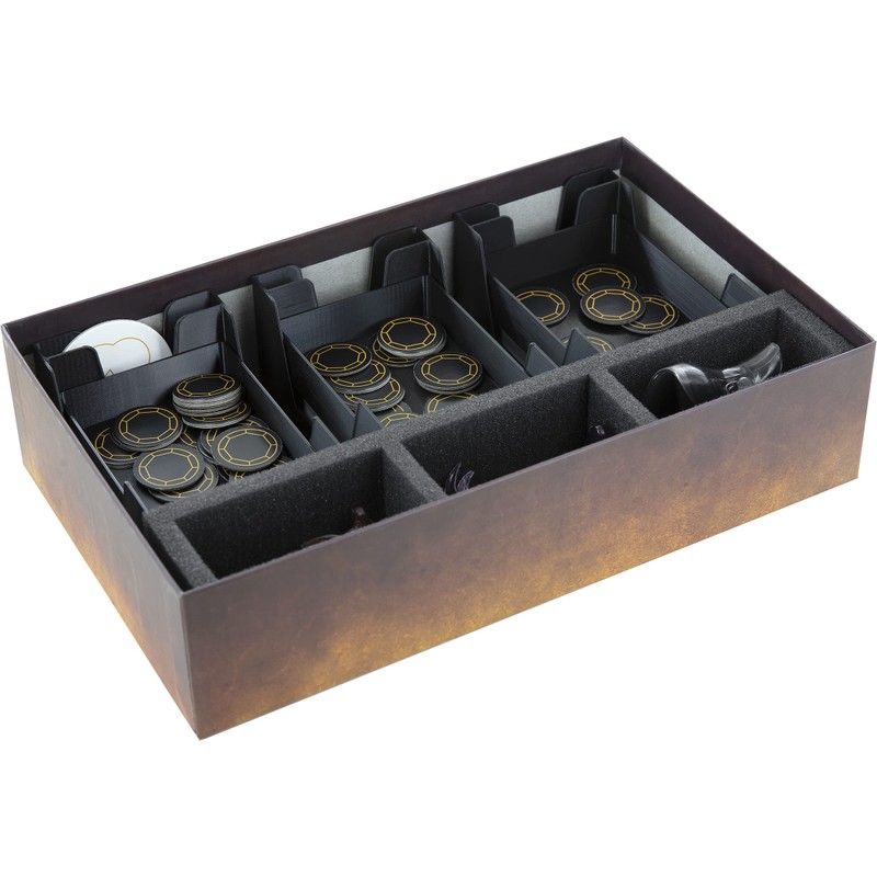 Of course, evil travels in style, but comfort shouldn't be lacking either. So that you don't get into conflicts of conscience, we have the right organiser plus foam set for your villains. So your miniatures are safely stored in the foam, while your cards and tokens are clearly sorted in the stylish plastic trays.