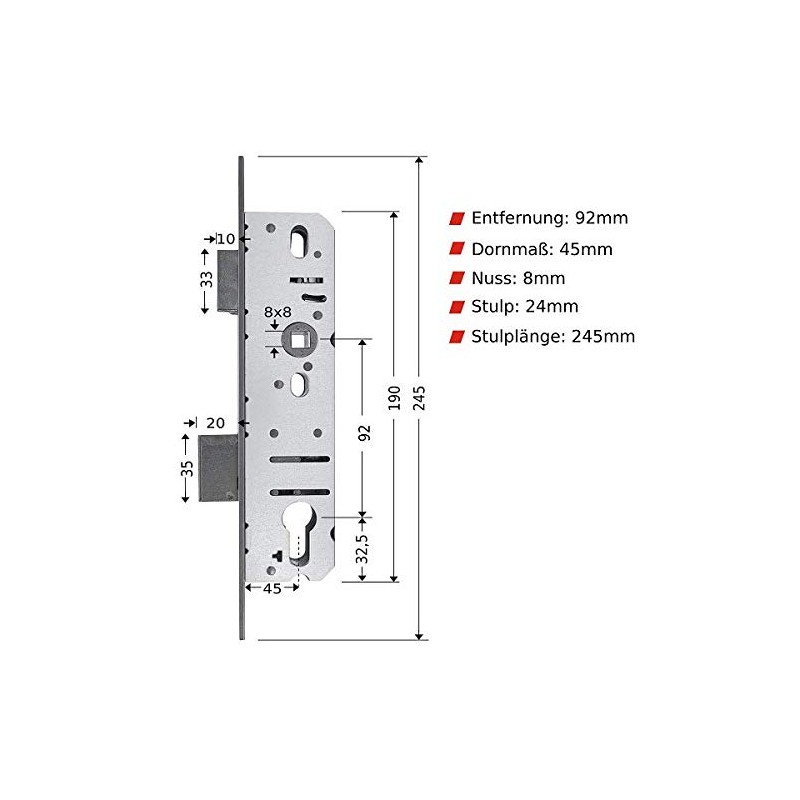 - Dimensions: backset: 45 mm, cuff width: 24 mm, cuff length: 245 mm, distance 92 mm, 8 mm square