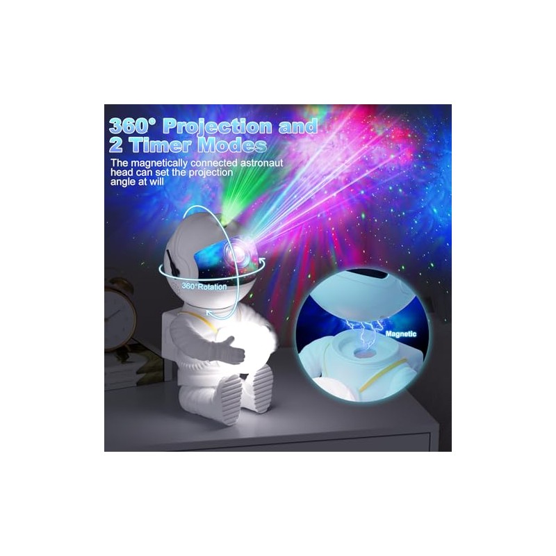 - [2 Haltungen & 360-Projektion] - Diese Astronauten-Projektionslampe kann fr die Projektion im Sitzen oder im Stehen eingerichtet werden. Gleichzeitig verfgt der Kopf ber ein magnetisches Design und kann um 360 gedreht und eingestellt werden. Sie k?nnen Sterne und Nebel berall projizieren und so dynamische und beeindruckende visuelle Spektakel an der Decke erzeugen.