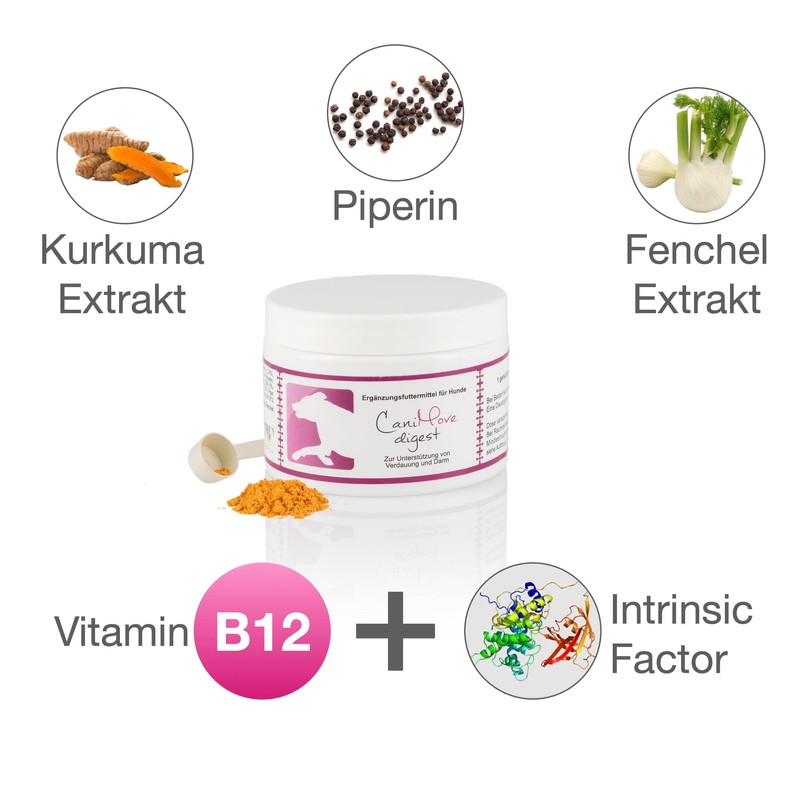 - High-quality ingredients: defined curcuminoids with increased bioavailability, vitamin B12 with the resorption peptide intrinsic factor. Ideal for cats.